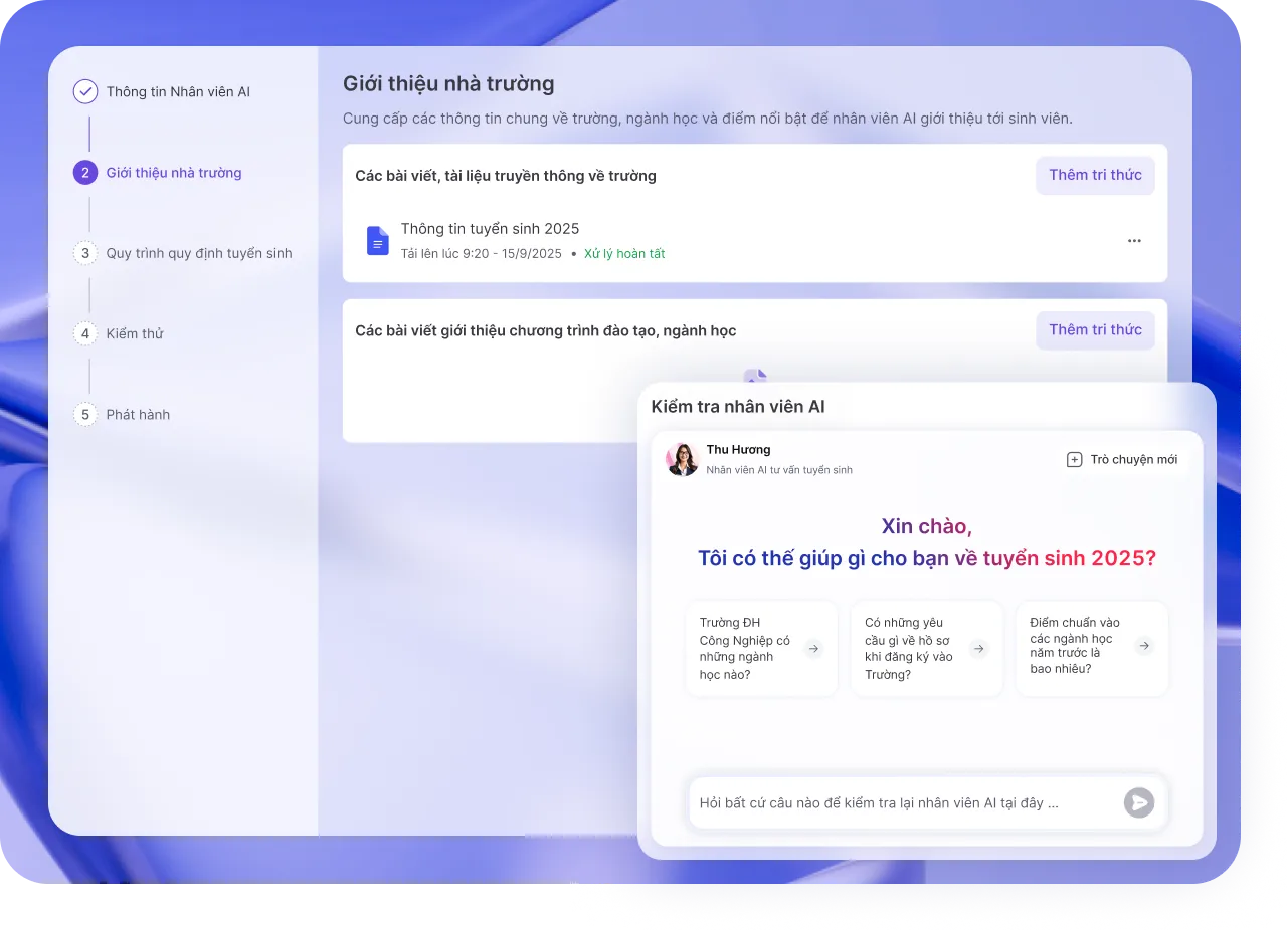 Cung cấp các tài liệu về quy trình, thủ tục cần sử dụng cho Nhân viên AI. Kiểm tra lại các câu trả lời AI để điều chỉnh phong cách trả lời hoặc bổ sung tri thức cho AI.