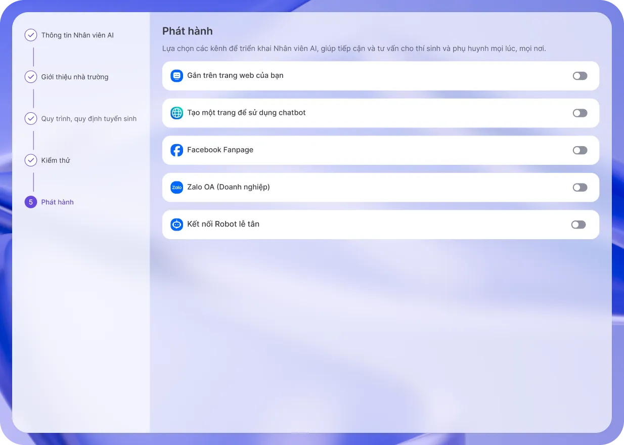Lựa chọn kênh phục vụ của Nhân viên AI: Website, Facebook, Zalo, Robot lễ tân